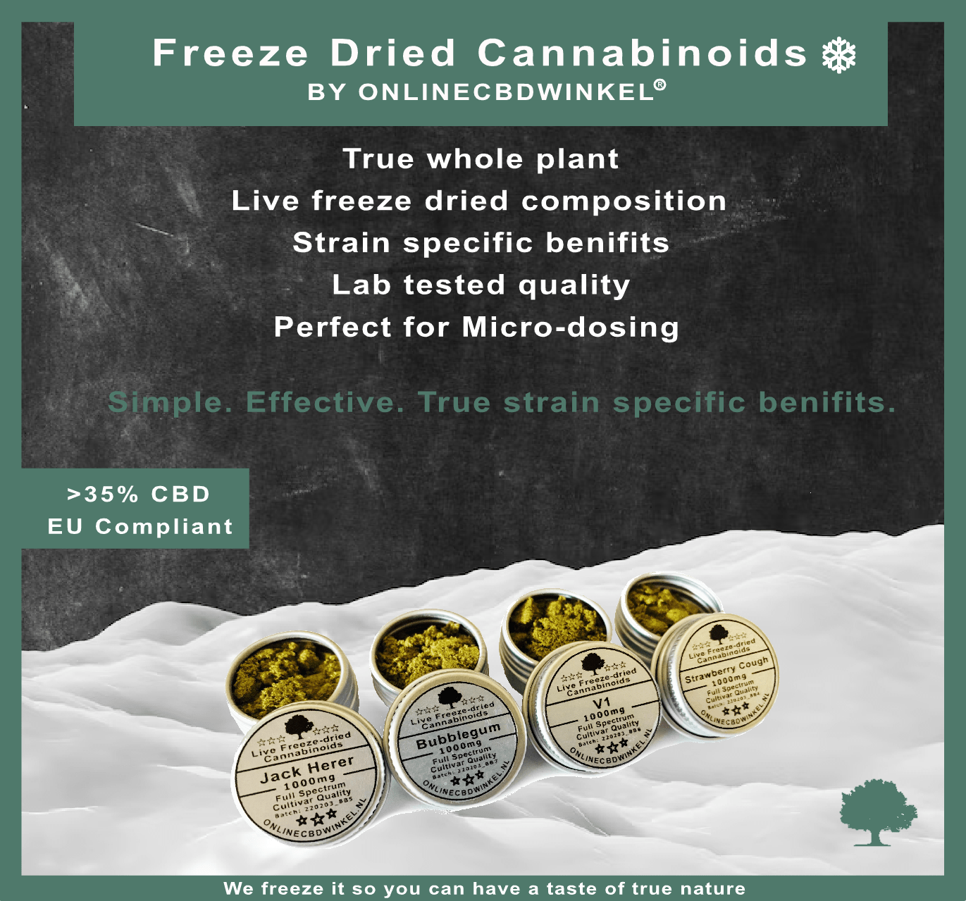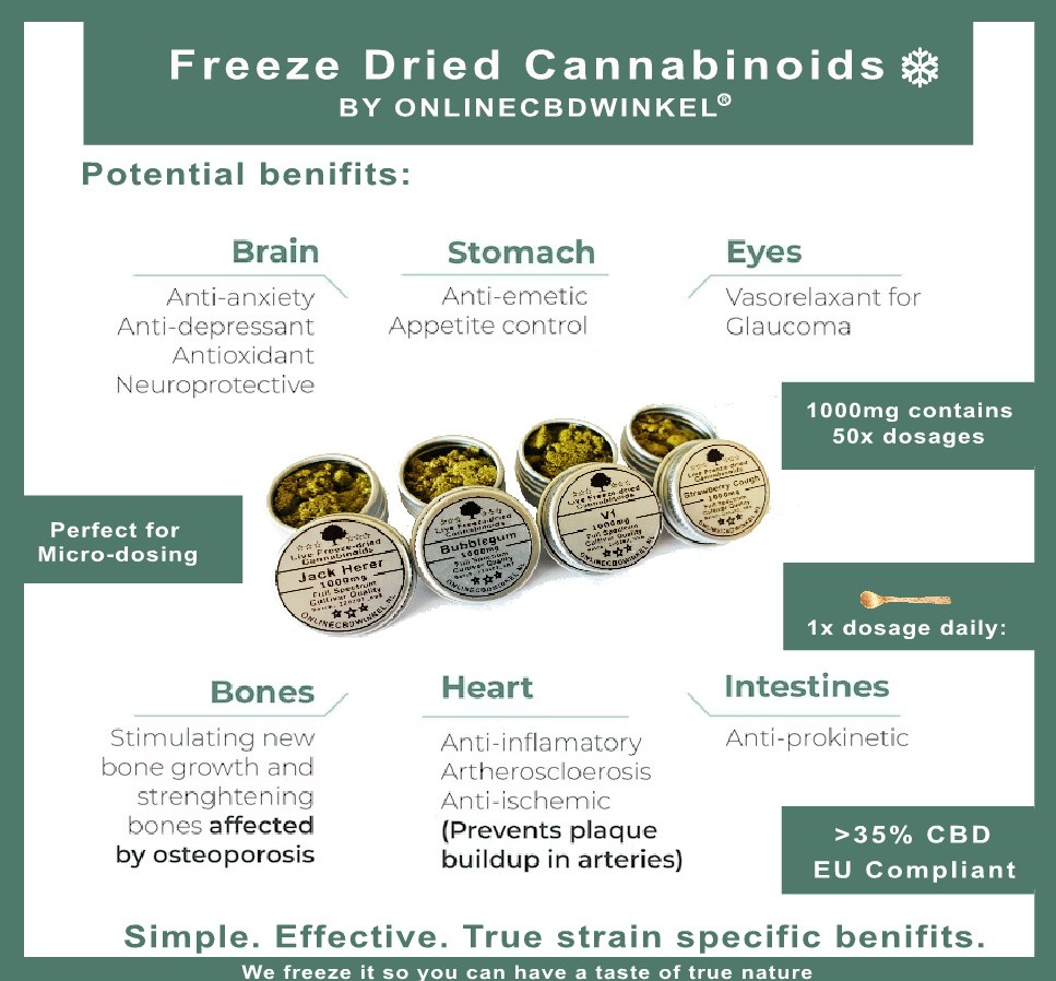 Een absolute primeur op CBD cannabis gebied in Nederland en wat ons betreft zijn dit de extracten welke de toekomst zullen vormen voor gericht mensen te kunnen helpen. Niet alleen hebben wij eindelijk de mogelijkheid om een complete lijn met strain specifieke CBD extracten te kunnen aanbieden, deze zijn doormiddel van vriesdrogen vervaardigd. Dat wil zeggen dat na de oogst door instant bevriezing alle natuurlijke stoffen die de plant bevat intact zijn gebleven waardoor het volledig therapeutisch potentieel van deze specifieke strains bewaard is gebleven en benut kan worden voor welzijn! Onbewerkter en vollediger ga je nergens vinden! Volledig EU compliant en met een THC percentage <0,2%.