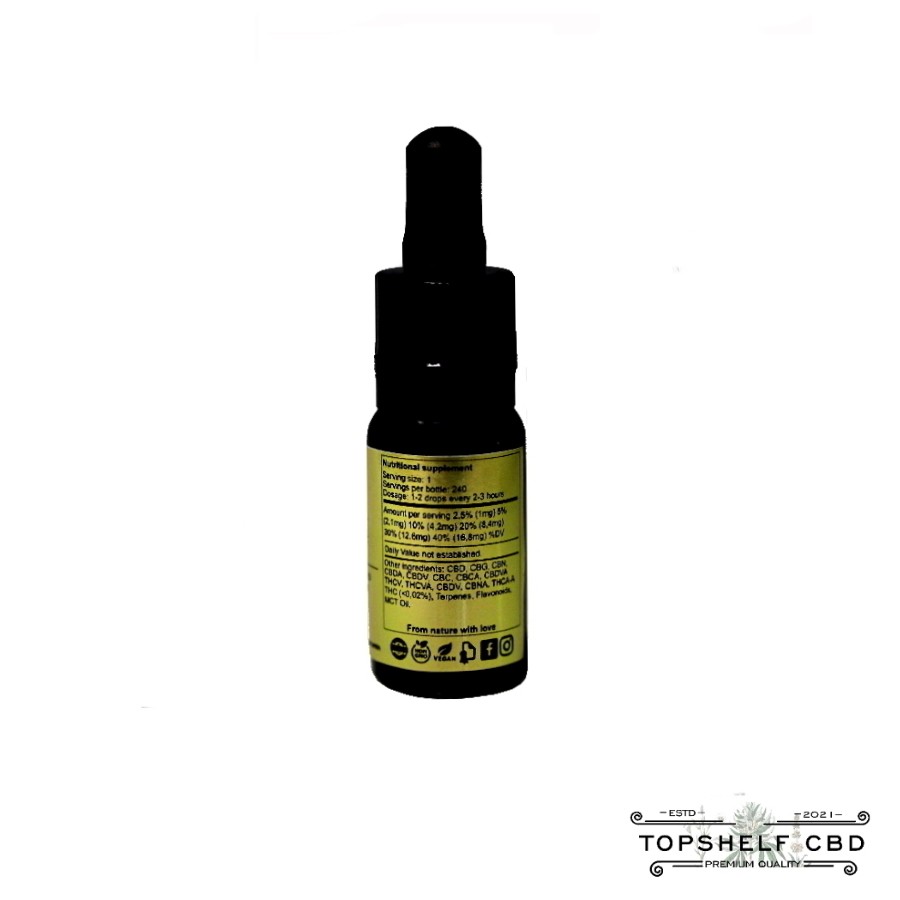 De CBDA olie is verkrijgbaar in de sterktes: 2,5%, 5%, 10%, 20%, 30% en 40%