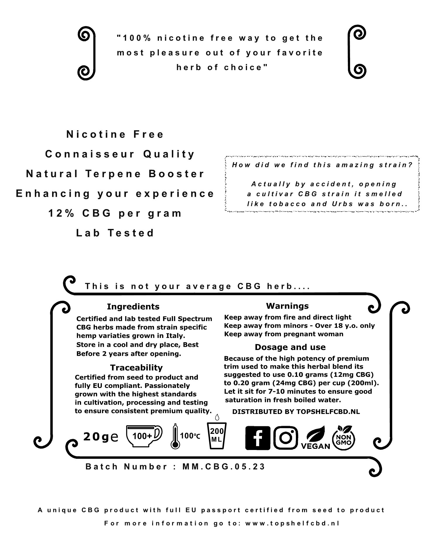 URBS is een product waar wij erg trots op zijn om te kunnen aanbieden en niet te vergelijken is met andere herbal blend producten. Wij zijn deze strain met pure toeval tegengekomen toen wij een zak CBG hennep open trokken en wij gelijk roken dat dit mogelijk de oplossing kon zijn voor veel toepassingen. Na het uitvoerig testen in combinatie met andere kruiden wisten we zeker dat we iets unieks in handen hadden.
